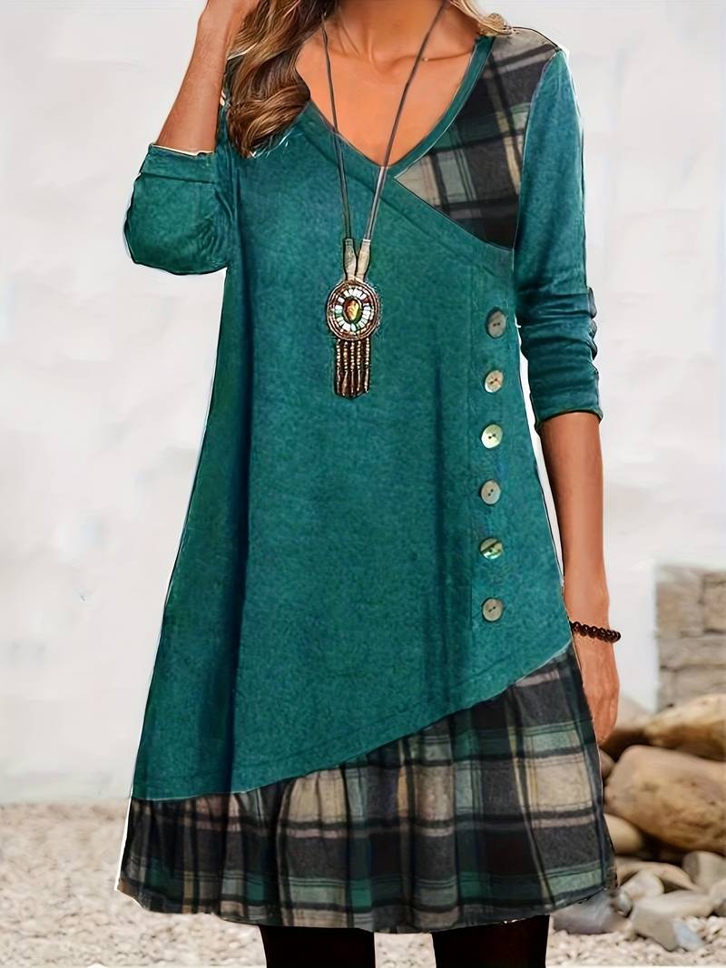 カジュアルな自信と快適さを追求したスタイリッシュなチェック柄パッチワークドレス!