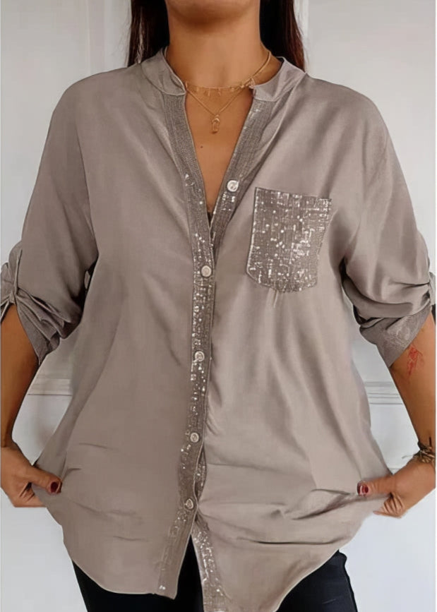 さりげない輝き:フロントポケットとボタン留め前立ての繊細なスパンコールのディテールが、コーディネートを格上げします。 これらのきらめくアクセントは、主張しすぎることなく洗練された雰囲気をプラスし、ちょうど良い量の華やかさを演出します。 カジュアルな外出や夜のくつろいだ集まりなど、どのような場面でも、このシャツは自然なエレガンスをもたらします。
