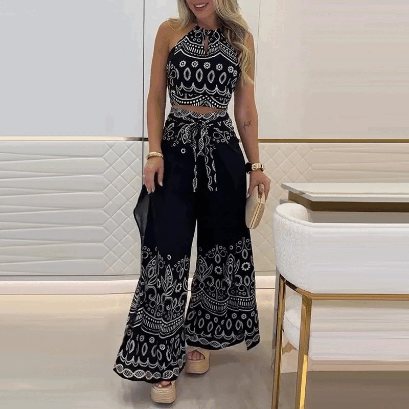 ✅シルエットが美しいデザイン: ハイウエストのワイドレッグパンツが脚を長く見せ、タイウエストがウエストラインを美しく引き立てます。ノースリーブのハーレムクロップドトップが、シックでモダンなカットで全体のバランスを調整します。