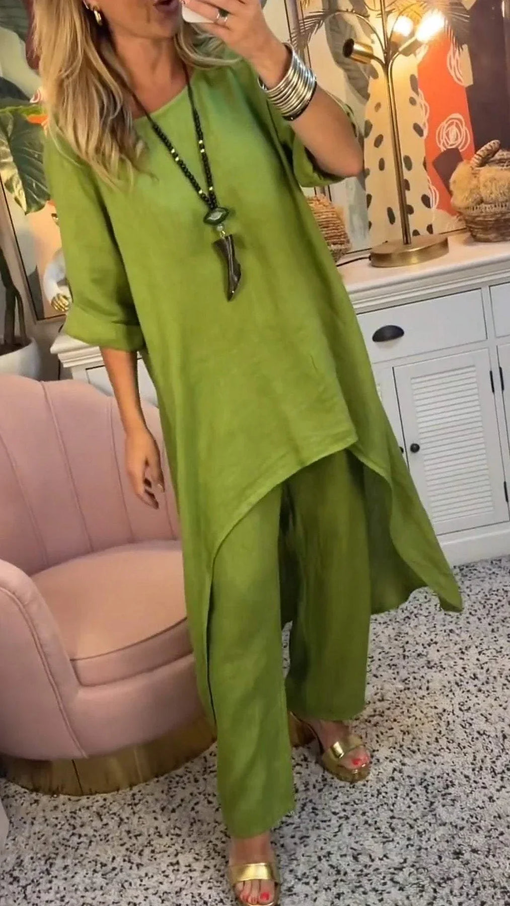 ✅気取らない優雅さ:流れるようなアシンメトリーなトップスとワイドレッグのパンツが、洗練されたシルエットを演出します。リラックスした雰囲気ながらスタイリッシュで、モダンなボヘミアンタッチが特徴です。カジュアルにもフォーマルにも簡単に着回せます。これがあなたの新しいラフなラグジュアリーアイテムです。