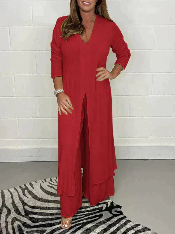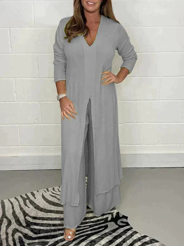 楽な着心地のエレガンス:スリット入りのメリスVネックツーピースセットの快適さとエレガンスを発見しよう!