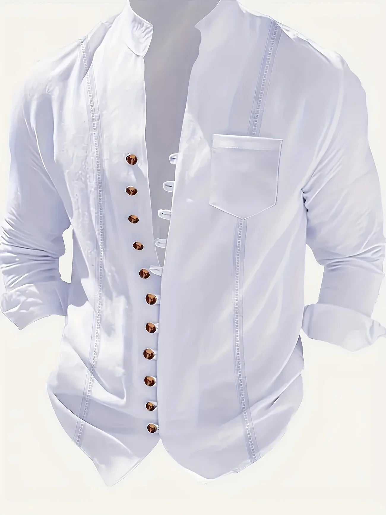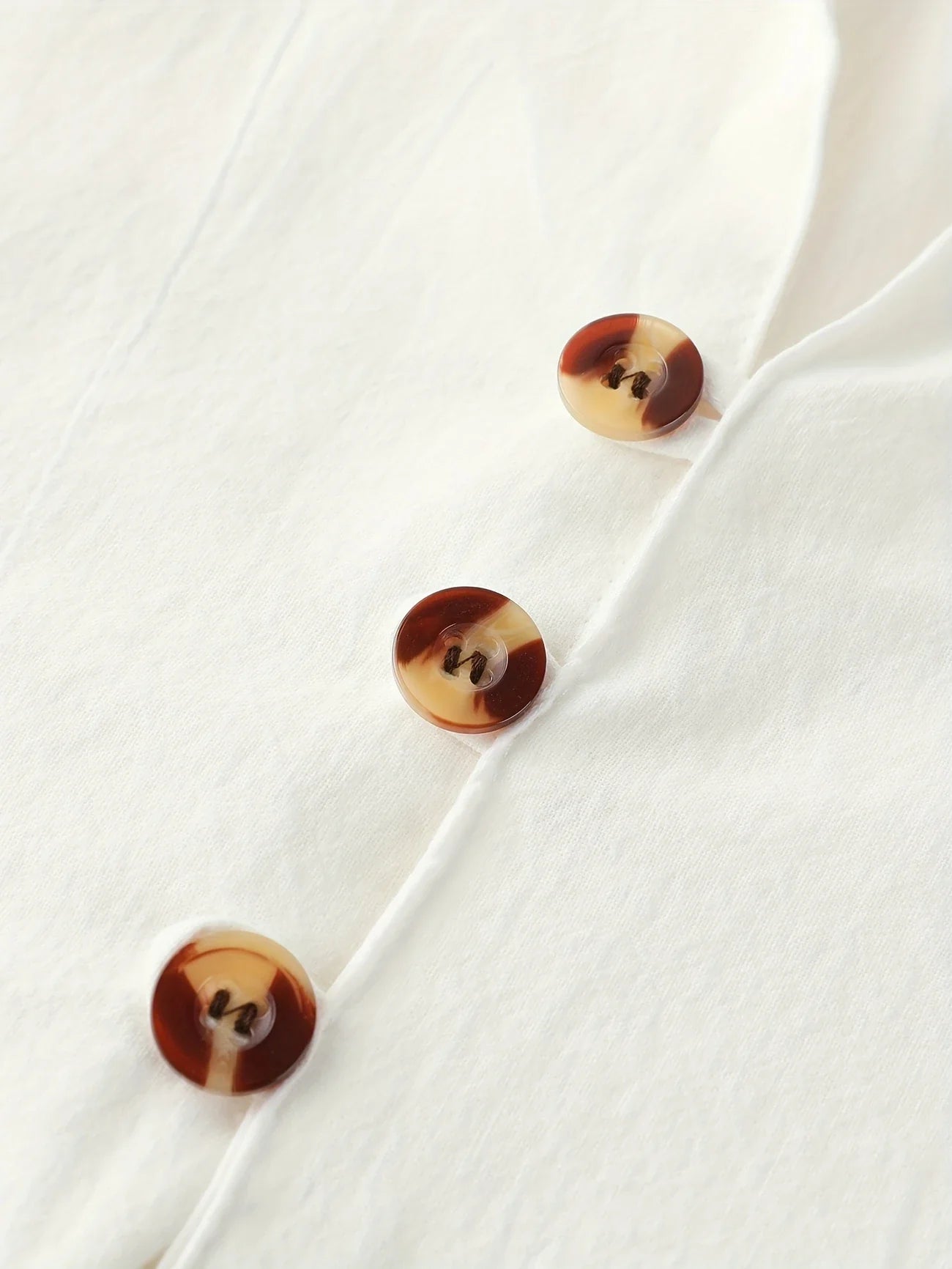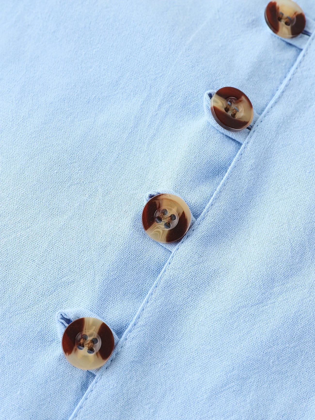 洗練されたボタンデザイン:シャツはマンドリンカラーとユニークなボタンデザインを採用し、ビーチやリゾートスタイルに上品なアクセントを加えます。これらの要素が全体のスタイルを格上げし、より高級感のあるビーチサイドのイベントにも適しています。