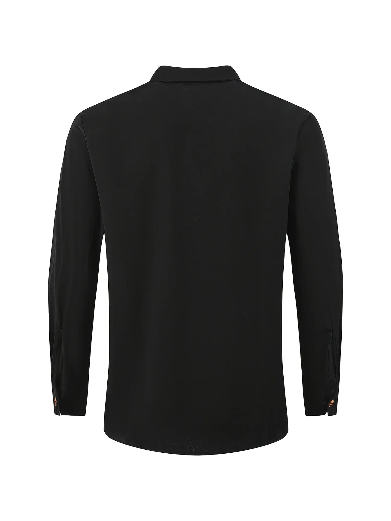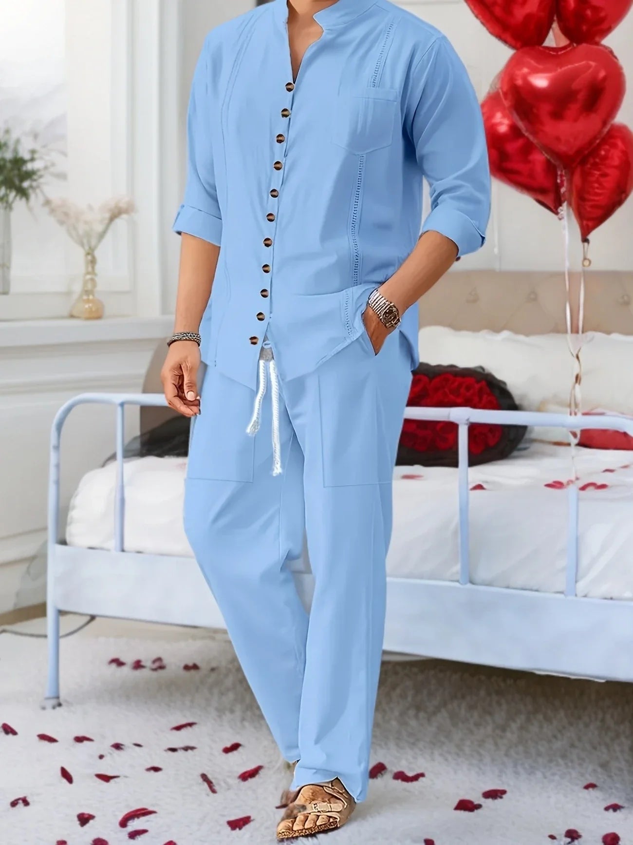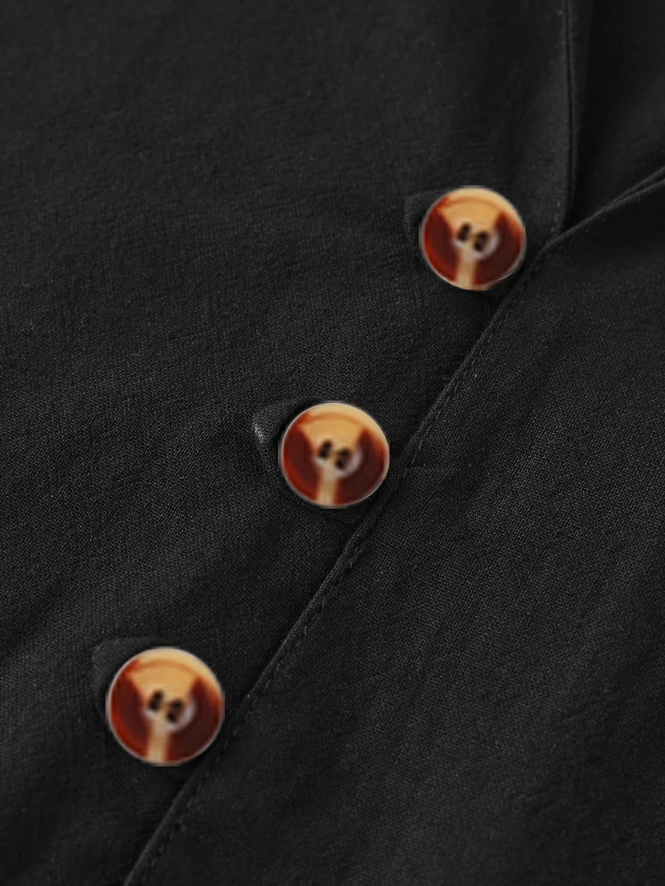 洗練されたボタンデザイン:シャツはマンドリンカラーとユニークなボタンデザインを採用し、ビーチやリゾートスタイルに上品なアクセントを加えます。これらの要素が全体のスタイルを格上げし、より高級感のあるビーチサイドのイベントにも適しています。