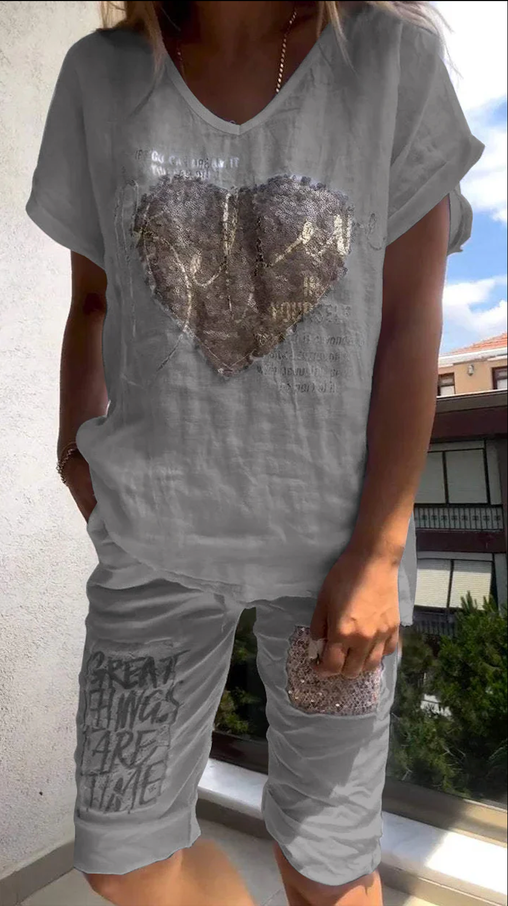 ✅ゴールドのエンボス加工でエレガントな雰囲気:トップスに施された美しいゴールドのエンボス加工のハートとその他のアクセントが、カジュアルなスタイルに洗練された雰囲気を添えています。この小さなディテールが際立ち、シンプルなツーピーススーツを、昼も夜のイベントにもふさわしい、存在感のある装いに仕上げています。